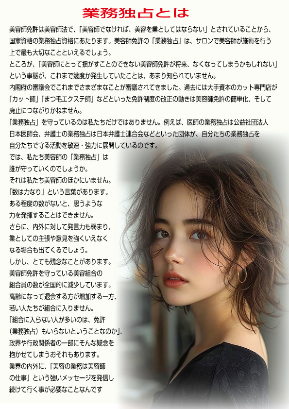 業務独占とは 2026 2/23 News 2026年2月23日 業務独占について全美連の文章から抜粋してみました。これを読めば、美容組合が業務独占のために何をしているのか?が少しは理解できるかもしれません。ぜひ一読してみてください。 News よかったらシェアしてね! URLをコピーしました! URLをコピーしました! 出張美容/訪問美容&ハートフル美容講習会 この記事を書いた人 松崎弘法 関連記事 出張美容/訪問美容&ハートフル美容講習会 2026年2月21日 111TH Top Masters プロモーション 2026年1月15日 110TH TOP MASTERS MODE AT TOKYO 2025年10月16日 第65回通常総会(令和7事業年度)開催 2025年5月23日 コシノジュンコパネルディスカッション&ファッションショーファッションショー開催 2025年3月19日 109回 TMライン普及講習会 2024年10月31日 2024 Top Masters Mode 109 2024年10月31日 第64回通常総会 開催 2024年5月30日